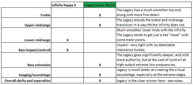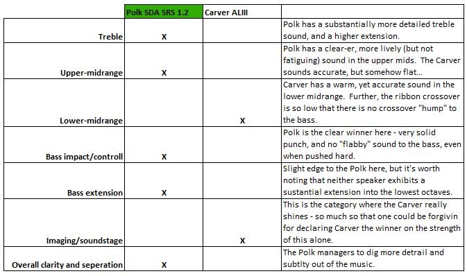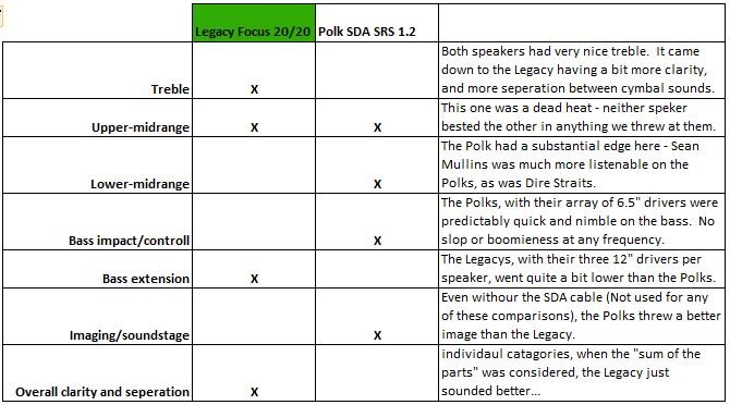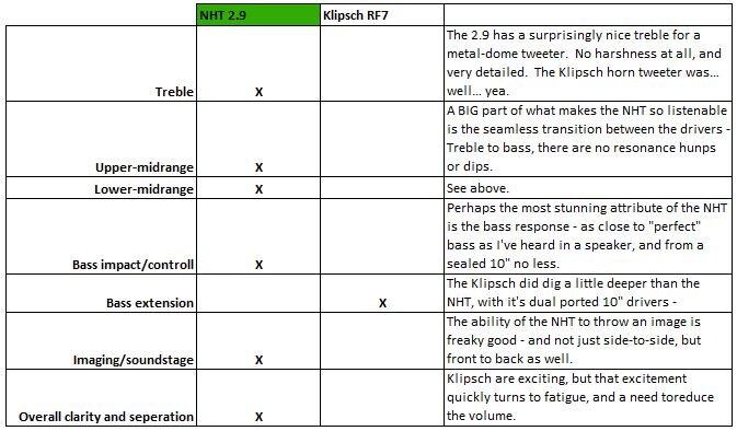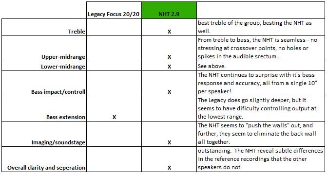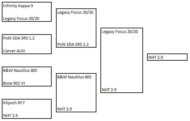 If logging in today and seeing a post from me brings you angst, worry not – I just wanted to share a neat experience I was able to have with a fellow “audiophile” (I hate that word), and then I shall fade back into the shadows. As some of you know, I have become quite smitten with NHT speakers of late. As some of you also know, I’m a bit of a speaker hoarder (Those days may be over, but more on that later). Tim (@phildent) was kind enough to acquire a set of NHT 2.9 speakers for me shortly after I left CA this spring. With the whole Covid landscape, logistics of acquiring the speakers from Tim has proven a challenge, to say the least. So I did what any speaker aficionado would do – I kept searching until I found yet another pair. This pair ended up being in Bozeman MT, about 5 hours north of me. These are not in perfect cosmetic condition, so I am still planning on meeting up with Tim at some point in the hopefully not too distant future. Needless to say, I’ve been enjoying the sound of the 2.9 speakers a great deal. That did not stop me from dragging out another pair of speakers to play for a while (as I often do). This time it happened to be the Infinity Kappa 9 set. Seeing as how these were once my “unicorn” and favorite speakers, I was taken aback at how NOT in love with the sound I was from the get go. So much so, that I was checking cable connections and polarity (Yes, I’ve made that mistake before). All being in order, I retired for the night. As luck would have it, a friend and fellow audio enthusiast was in my neck of the woods for a few days. I asked him to come over for dinner, but my real motivation was to have someone “ground” me, with regards to my feelings on the NHT and now the Kappas. Travis (No affiliation to the forum) is a great guy with a fair bit of audio experience, but most importantly, he’s not afraid to hurt my feelings and tell me I’m full of shit. If you have a friend like this, cherish them – they are far more useful than someone who will kiss your ass and tell you they love everything about your system. Long story short (I know, too late), Travis comes over and really likes the 2.9. A lot. We also listened to the Kappas (He was more forgiving than I), and the Polk SDA SRS. 4 hours later, he heads out. I get a text the next morning (He sent it at 2am), saying we should do a March Madness style bracket/comparison with the NHT, Polk, Infinity and another speaker. I mull it for a minute and reply “How about a bracket of 8 speakers”? His instant reply “I’ll bring the beer…”. What transpired was two additional 4-5 hour evenings of listening, listening, and listening. And then listening some more… We bracketed the speakers by random number generator, as there was no other logical way to “seed” them. The first night we did the “quarter finals”, and the second night we did the semis and then the final round. Going in I would have thought that as the listening session went on it would be harder and harder to discern the subtle differences between speakers. However, quite the opposite was true – the longer we listened, the easier it became to spot the subtle differences between the speakers and music tracks. I am also happy to report that other than the Legacy Focus 20/20 vs. Polk SDA SRS 1.2 round, we were in total agreement – that one round was a tad contentious though, and it really could have went either way. The other thing I found fascinating was that with the exception of the Bose, B&W and Carver, all of the other speakers were my absolute favorite at one time or another. Now I find several of them somewhat, and in some cases severely, lacking. Funny how our tastes evolve… Here are the contenders: B&W Nautilus 805 – I purchased these from the original owner about 4 years ago. They are mint in box, and unmodified, as far as I know. Bose 901 VI – I purchased these about 5 years ago, only because they are in mint condition, and they have the original EQ and “tulip” stands. I’ve never owned a serious Bose product, and just wanted to play with them… Carver ALIII – I acquired these for a steal ($400) about 7 years ago. One of them had sat in about an inch of water, and the base was ruined. I manufactured new bases for both speakers, and installed Infinity “perfect 10” woofers. I eventually removed the woofers and replaced the stock drivers. Infinity Kappa 9 – I acquired these about 8 years ago. The woofers have been professionally re-foamed, and no further modifications have been done. Klipsch RF7 – I bought these new in 2008, as part of a 7 channel setup (RC7 and RS7x4). I have upgraded the crossovers with film caps and air-core inductors. I also installed the “resistor mod”, but quickly removed it, as I found it detrimental to the sound (there’s a thread on that here somewhere, if one cares to look it up). Legacy Focus 20/20 – Perhaps my “highest end” speakers, I acquired them from the original owner about 4 years ago. They are bone-stock, as far as I know. NHT 2.9 – After having Tim acquire a pair of these on my behalf this spring, I just couldn’t wait to get them from LA to my house in UT, so I took a quick trip up to Bozeman MT and bought a pair from the original owner. They are not pristine looks-wise, so yes Tim – I still want the pair you have on hold for me… Polk SDA SRS 1.2 – I traveled to Denver CO to acquire these about 3 years ago. They have an interesting history, as they were once owned by member “madmaxx”, prior to his passing. They have been modified with the RDO194 tweeter upgrade, the woofer baskets are dynamatted, they have a full set of “Larry’s Rings”, and the SDA cable has been rebuilt with MIT cable and Nutrik connectors. NOTE – the SDA cable was NOT used for this evaluation. The signal chain: Source - Oppo BDP 105 running SACD, DVD-A, and FLAC. Preamp – Round one was completed with a 10-Octave line stage pre. The second and third r