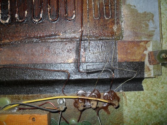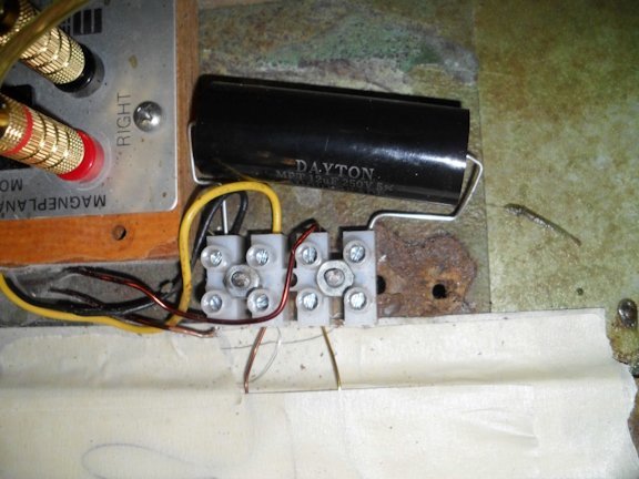 Once the new runs have been allowed to set in the adhesive, you need to apply the 3M NF30 (Milloxane) sealant. Although the can sent by Magnepan had a small brush applicator included I decided to use a 1" foam brush for applying the sealant. I applied two light coats, waiting 12 hours between each one. Light coats is the key here as you want the mylar to remain flexible. While these were drying I decided to work on the crossover network. I had ordered some replacement capacitors as I assumed the existing ones would be dried out after 40 years and the values changed. Just for grins, after removing the caps, I tested them on my little component tester. Yep, confirmed; both capacitors were definitely way out of spec. They were supposed to be 12mfd and tested out as roughly 38mfd; definitely changing the bandwidth of the circuit. I also decided to replace the "connection block" (nothing more than some connector rings riveted to the mounting plate) with something a bit more forgiving to work with. The old connections were made using silver solder due to the dissimilar metals being used (copper wires, copper connectors and aluminum wires). Although I was trained in the Navy on how to solder to aluminum with silver solder, the process is not easy and I'm far out of practice. All pieces to be soldered need to be scrupulously clean and heated to the right temperature. I made one attempt and decided on a better method. I substituted a standard screw terminal connection block. All wires/component wires were sanded clean, dipped in No-Ox-ID (to prevent oxidation/corrosion) and then placed into the block. 1st pic shows entire panel coated with Milloxane 2nd pic shows original crossover network with connections