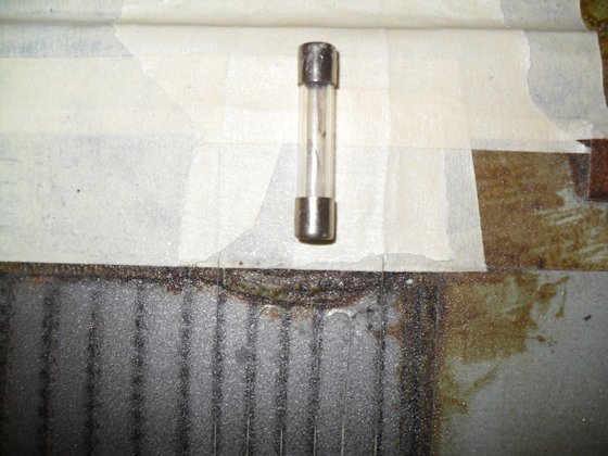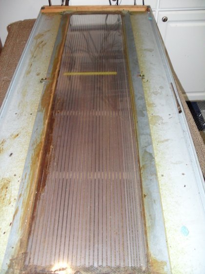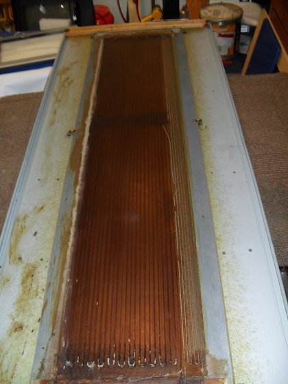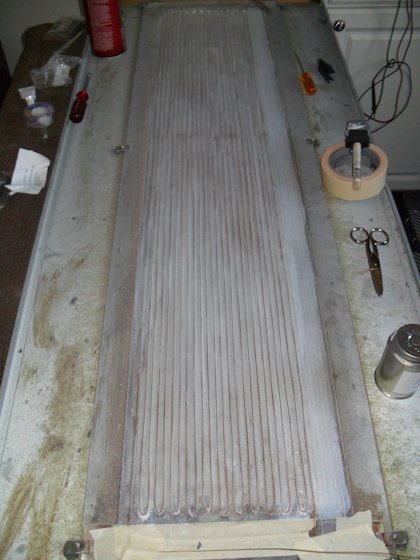 This pic shows the panel all cleaned and holes repaired. Note that you can see through the mylar to the wires hanging off my shop wall.