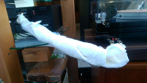 Andrewjohn, Thanks for your comment. My design goal was to attempt to get as close to an air dielectric as possible and eliminate as many forms of dielectric absorption and potential capacitance as possible. Therefore, I am limiting myself to cotton which yields a 99% air dielectric. My very first experiment was wire in the air not surrounded by anything knowing that I would have high hum and noise. Surprisingly, I was able to reduce hum by shifting the wires around, and reduce noise using shields over the power supplies of the other components. I will make the final set of interconnects when my RCA connectors arrive. This final configuration will use cotton clothesline rope wrapped tightly with cotton twine to insulate the hot wires in the barrels of the connectors. I am also going to rework the core to make a slight upward curve to raise my preamp further above the turntable and power amplifiers.