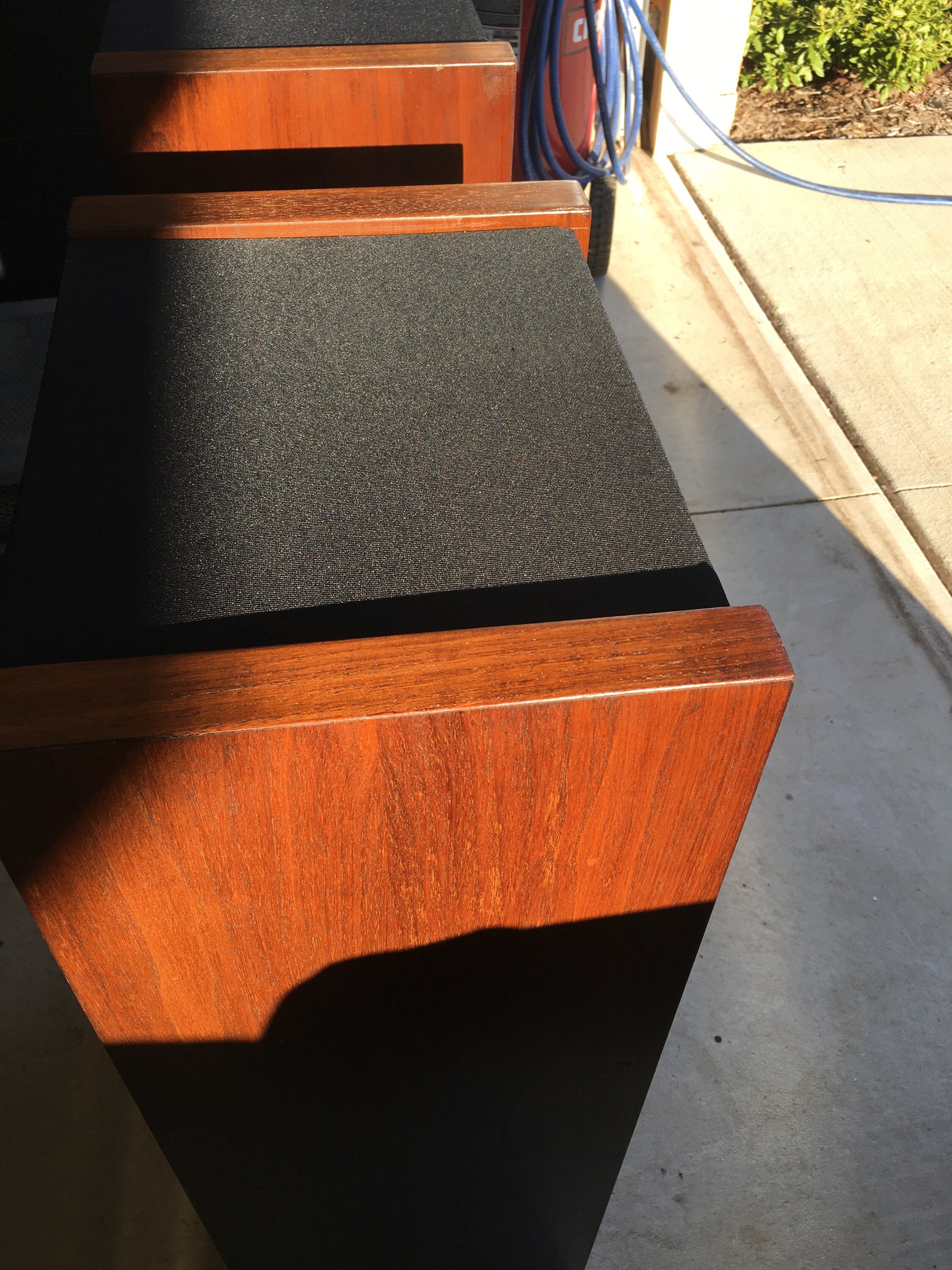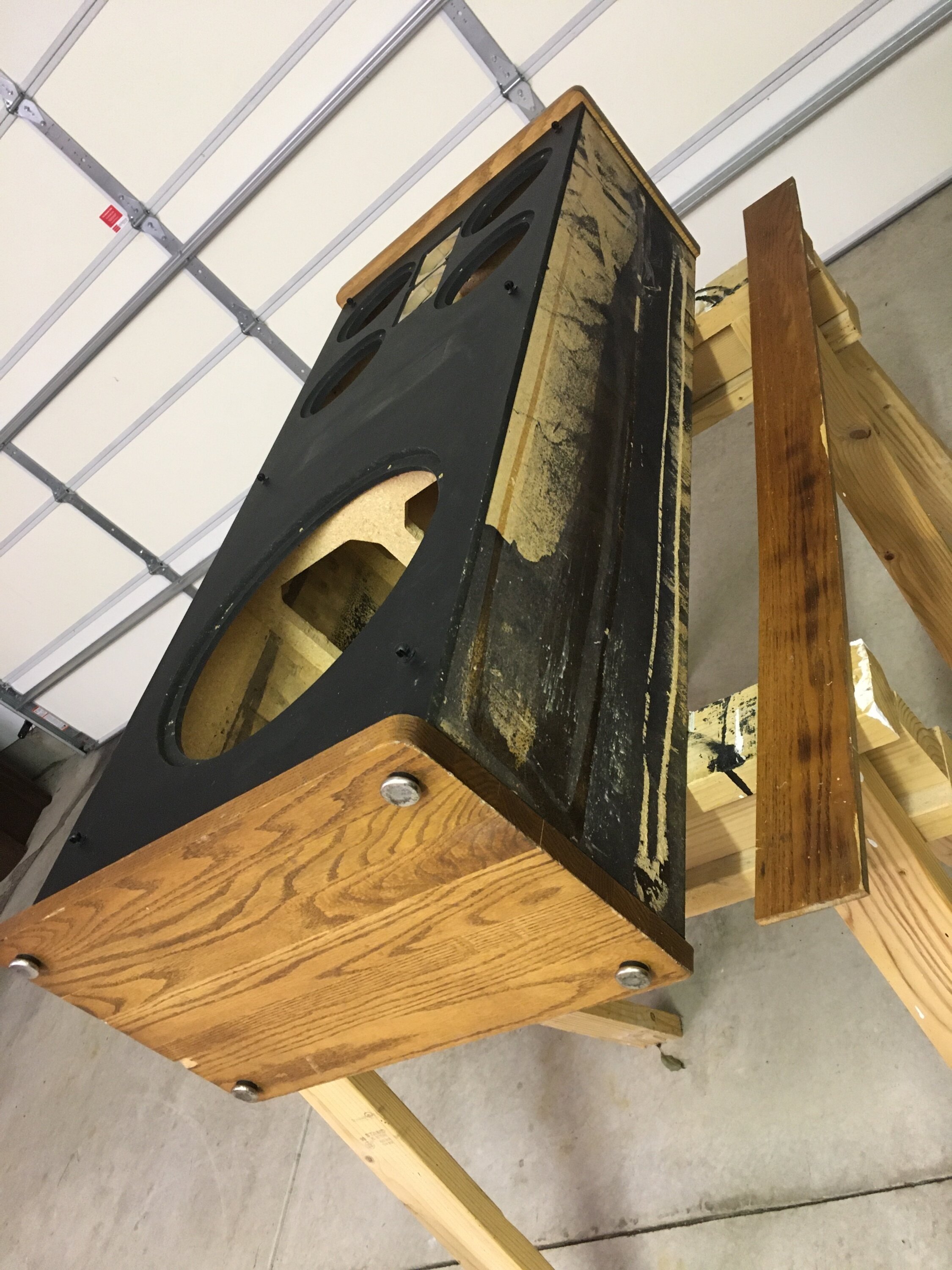 Rob 5,985 Posted July 19, 2022 Author Posted July 19, 2022 Finally with all this extra time on my hands again this summer because of part shortages, yes I am laid off again. I pulled up the Polk's to the garage and giving them a cosmetic restore. Been wanting to do this for a long time but Benn enjoying them with different amps and such. Hopefully I will have them finished by this weekend. This is the ugly one that someone cut the whole in it and decided to add their own style of tweeters. I mixed up some epoxy to try and even out the wood piece I used to fill the hole. Need the epoxy to fill in the cracks mostly. I bought the oak veneer and they will have new sides as well as new fabric on the sides. 3